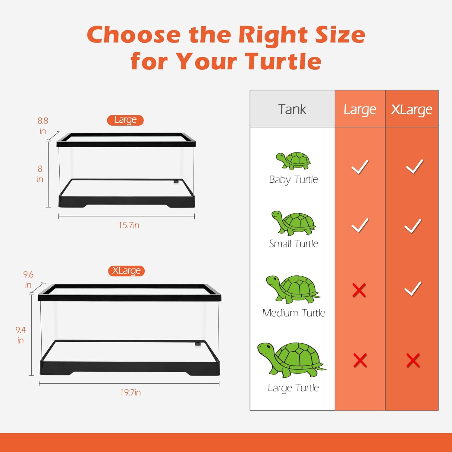- Size Selection: Available in S/L/XL—Small fits baby turtles (shell >3.93"), Large for small turtles (shell >5.25"), and XL for medium turtles (shell >6.56"). Each tank provides a comfortable environment to support healthy growth and daily activity