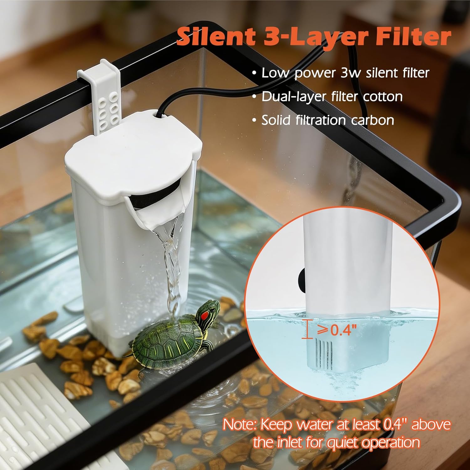 - Silent 3W Filter with Extras:Maintains clean water with a quiet, gentle flow. Includes 2 extra filter plates and a hook for added stability. To reduce noise and prevent dry burning, rinse the motor regularly and keep the inlet fully submerged